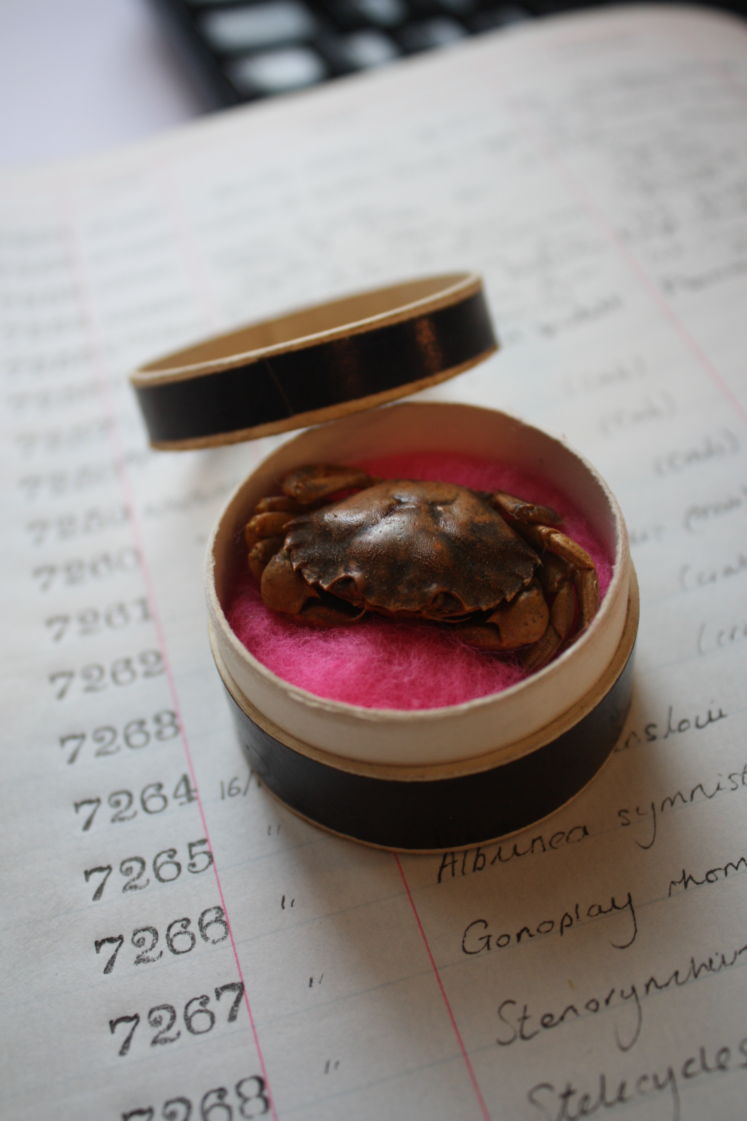 Crustaceans have a feminine side too! Here is a tiny specimin sat on a lovely pink bit of padding!! Photographed on top of the old register which I use to check for specimens identity.