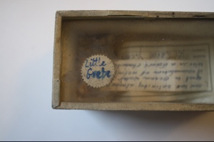 I came across a group of specimens in a box, with a starry label on the glass reading ‘Little Grebe’. As a Grebe is a type of bird, I was slightly confused by this. I decided to look into whether this was relating to the specimen, and found a piece of paper in the box which read:
